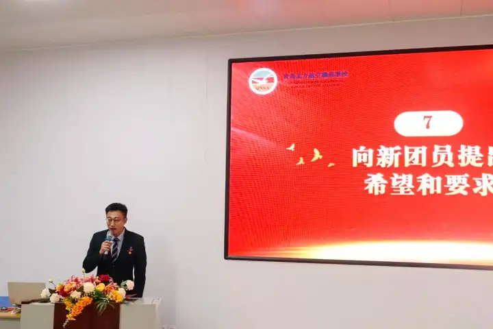 学生处处长苟莲飞以真挚恳切的言辞解读入团的责任与光荣,宣读新团员名单。他勉励新团员,要牢记团员使命,用一言一行践行入团誓言,珍视这份光荣身份,脚踏实地,让青春在奋斗奉献中焕发光彩。