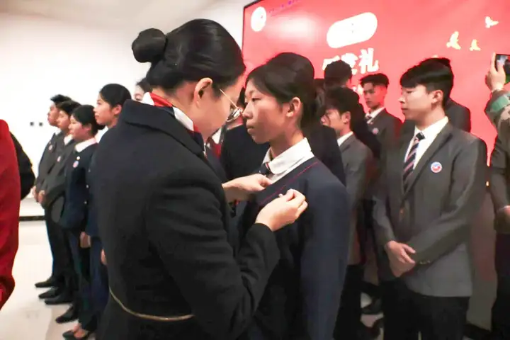 民航专业部部长于志浩、综合专业部部长刘玉容、徐洪成老师为新团员代表佩戴团徽。崭新的团徽从师长手中佩戴于新团员胸前,每一个瞬间,都承载着对新团员的深切厚望。