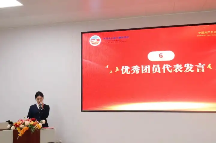 优秀团员代表姜卜文同学登台分享成长经验,结合自身学习与实践经历,将团员的责任与担当娓娓道来,言语朴质却满含力量。她鼓励新团员们要时刻以团员标准严格要求自己,主动担当,奋勇争先,在点滴积累中践行青春使命,用实干书写属于新一代的荣光。