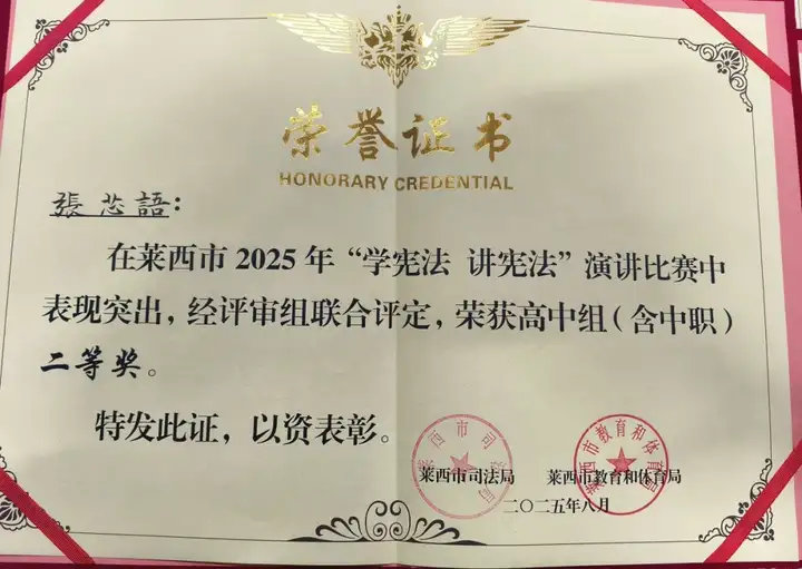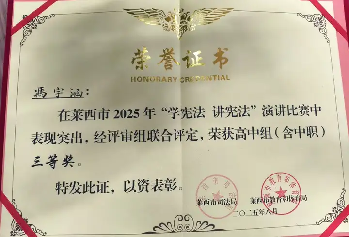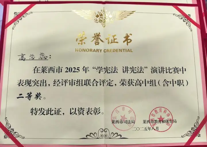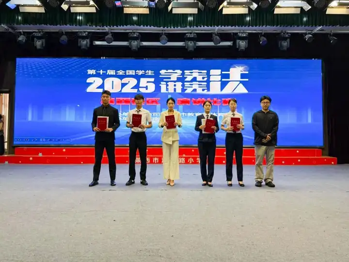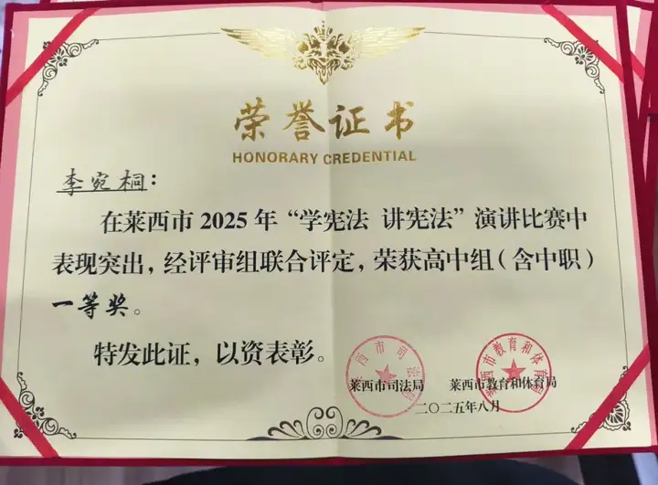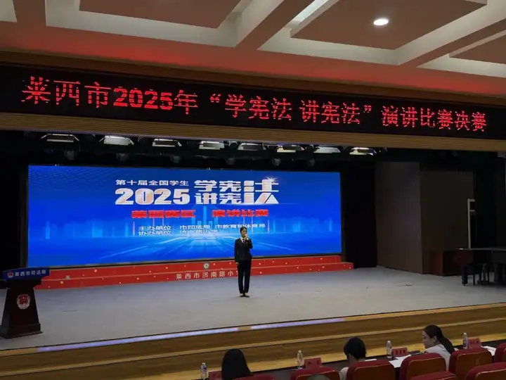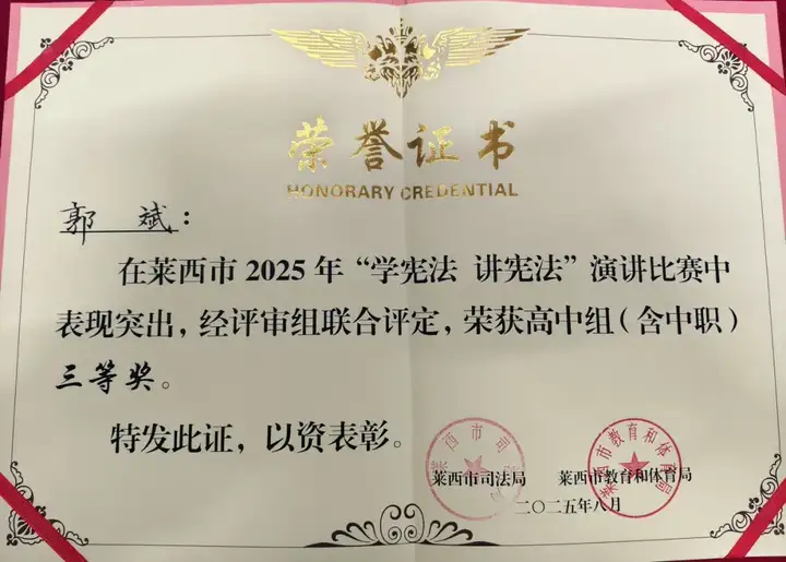 在刚刚落幕的莱西市2025年"学宪法 讲宪法"演讲比赛决赛中,青岛航校5名同学在马逸燃老师的带领下奋勇拼搏,成功闯入决赛,并最终斩获一等奖1项、二等奖2项、三等奖2项的优异成绩!